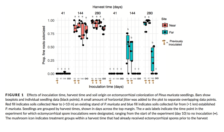Peay, KG. 2018. Timing of mutualist arrival has a greater effect on Pinus muricata seedling growth than interspecific competition. Journal of Ecology, 106: 514–523.