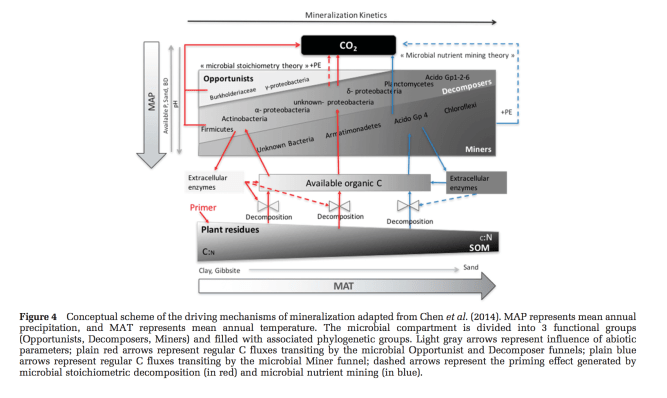 The priming effect is the variation in microbial decomposition rate of soil organic matter (SOM) after the input of fresh organic matter. Competition for energy and nutrient acquisition induce shifts between microbial communities specialized for various sources of SOM: fast-growing r-strategists benefit by extracting energy from easily available substrates (stoichiometric decomposition) while slow-growing K-strategists decompose more recalcitrant sources of SOM to release nutrients (nutrient mining). Interactions between C and N availability therefore drive the strength and extent of the priming effect. In Madagascar, the authors studied how climatic parameters (mean annual temperature) affect the priming effect by modifying the edaphic variables and selecting for different soil microbial communities. It seems that under cold climates the priming effect was generated mostly by fast-growing SOM decomposers. Conversely, warmer climates enhanced the priming effect generated by nutrient mining. By affecting the mechanisms of priming effect, the consequences of climate change on soil carbon sequestration may become larger than previously assumed.