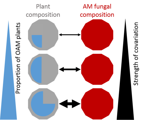 Graphical abstract: Showing how the strength of correlation between plant and AM fungal communities in grasslands depends on the abundance of obligatory AM plants in the plant community. The higher is the abundance of obligatory AM plants, the stronger are plant and AM fungal communities related.