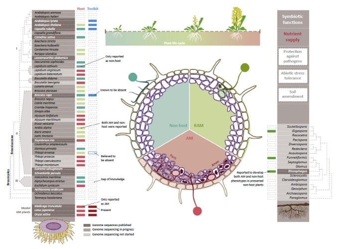 Figure 1. Interactions between Members of the Brassicaceae Family and Arbuscular Mycorrhizal (AM) Fungi (visit the paper for details and references). On the left side, a phylogenetic tree depicts the members of the Brassicaceae family of which genome sequences have been published or are being processed according to Koenig and Weigel [4]. The phylogenetic tree was complemented by a few additional Brassicaceae members for which information on AM host status was available in the literature. The model AM plant species used to describe the required symbiotic toolkit are listed at the bottom. The column ‘Host’ summarizes information on plant host status compiled from literature cited in this Opinion. The column ‘Toolkit’ summarizes information on the symbiotic toolkit as documented by Delaux et al. [8]. For a detailed list of the toolkit genes that are absent in non-host plant species, see Table 1. In the center, a root transversal cross-section illustrates different host phenotypes: the (AM) host phenotype that accommodates the Paris type of colonization, the Arum type of colonization, or intermediate types of both as described by Dickson et al. [27]; the non-host, in which endogenous AM fungal colonization never occurs; and the rudimentary AM (RAM) host as coined in this Opinion to characterize those plant species that do not form prominent AM phenotypes but can harbor a few symbiotic fungal structures. The illustrated plant growth stages presented at the top reflect the potential variation in host ability to form AM symbiosis throughout plant development. On the right, various symbiotic functions of AM fungi are summarized, along with a phylogenetic tree of AM fungal genera according to Krüger et al. [90]. The color-coded column associated with this tree summarizes the AM fungal genera for which at least one species was shown to interact with at least one presumed non-host plant species.