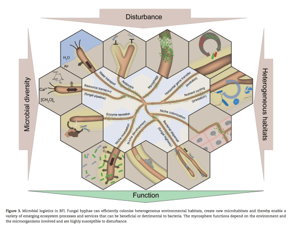 Bacteria driving on the fungal highway. Given that mycelia vastly extend in soils, they constitute ideal transport route for bacteria. Fungal mycelium easily adapt to environmental disturbances or the heterogeneous distribution of nutrients. For example, fungi can translocate resources between ‘feeder’ hyphae growing in optimal environments, to exploration hyphae in more unfavorable areas. By re-allocating their biomass, they can colonize new habitats or access heterogeneously distributed nutrients. These ‘fungal highways’ can also serve as dispersal vectors for bacteria, giving them access to new habitats and nutrients. Mycelia-facilitated bacterial dispersal likewise promotes new niche colonization, food degradation, or the co-invasion of tissues during pathogenesis.