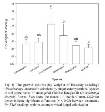 Discovering new ECM fungi can occur not only in roots but also in the soil spore bank. In Chinese Douglas fire forests, ECM communities in spore banks were significantly different from those from the roots of mature trees. An unknown Rhizopogon species was very abundant in the spore bank and had positive effects on seedling growth. A good candidate for forest regeneration projects of this endangered tree species.